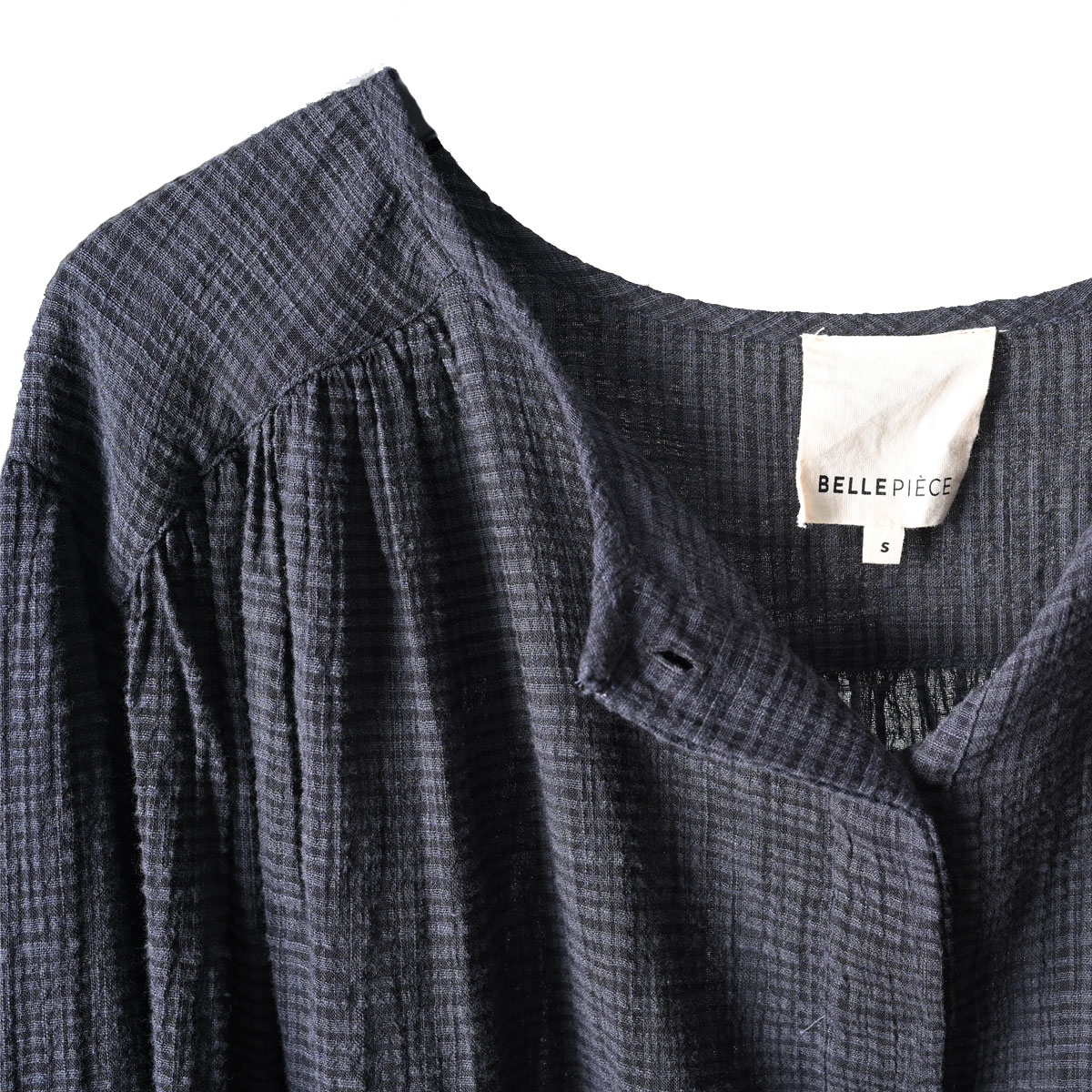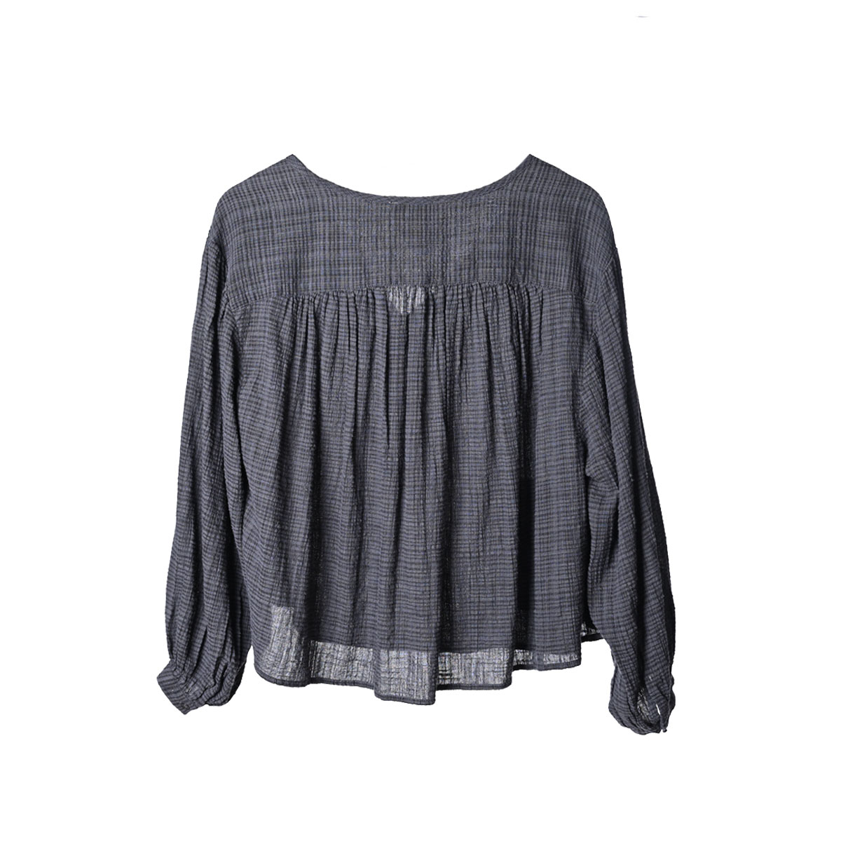 Réalisation : Blouse réalisée dans une matière tramée en coton et viscose, coupe légèrement évasée, col rond, Patte de boutonnage milieu devant, une poche plaquée sur le devant, manches longues.