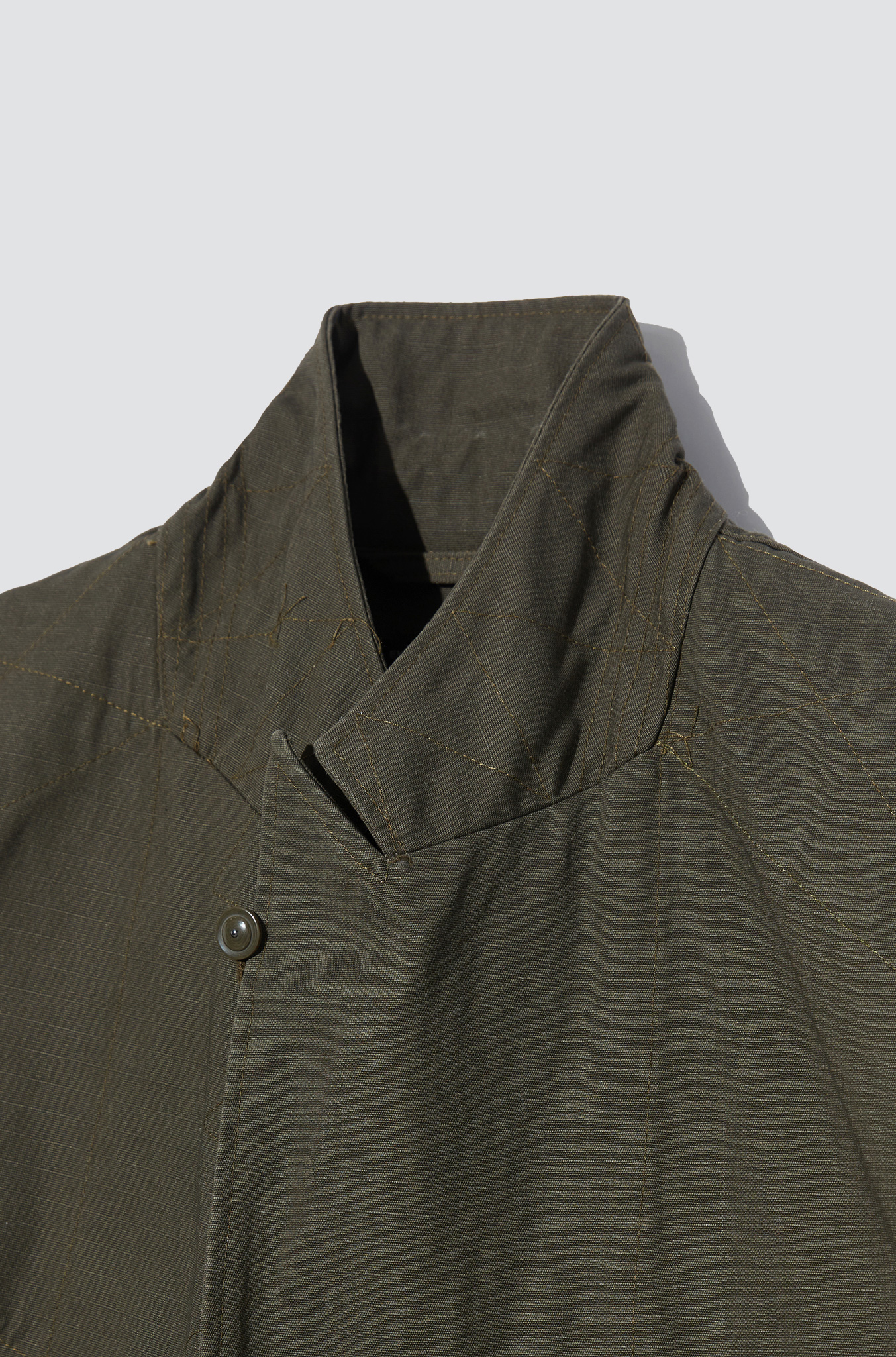 100% cotton, ripstop, removable coin buttons, peaked lapel, four exterior patch pockets, two interior pockets