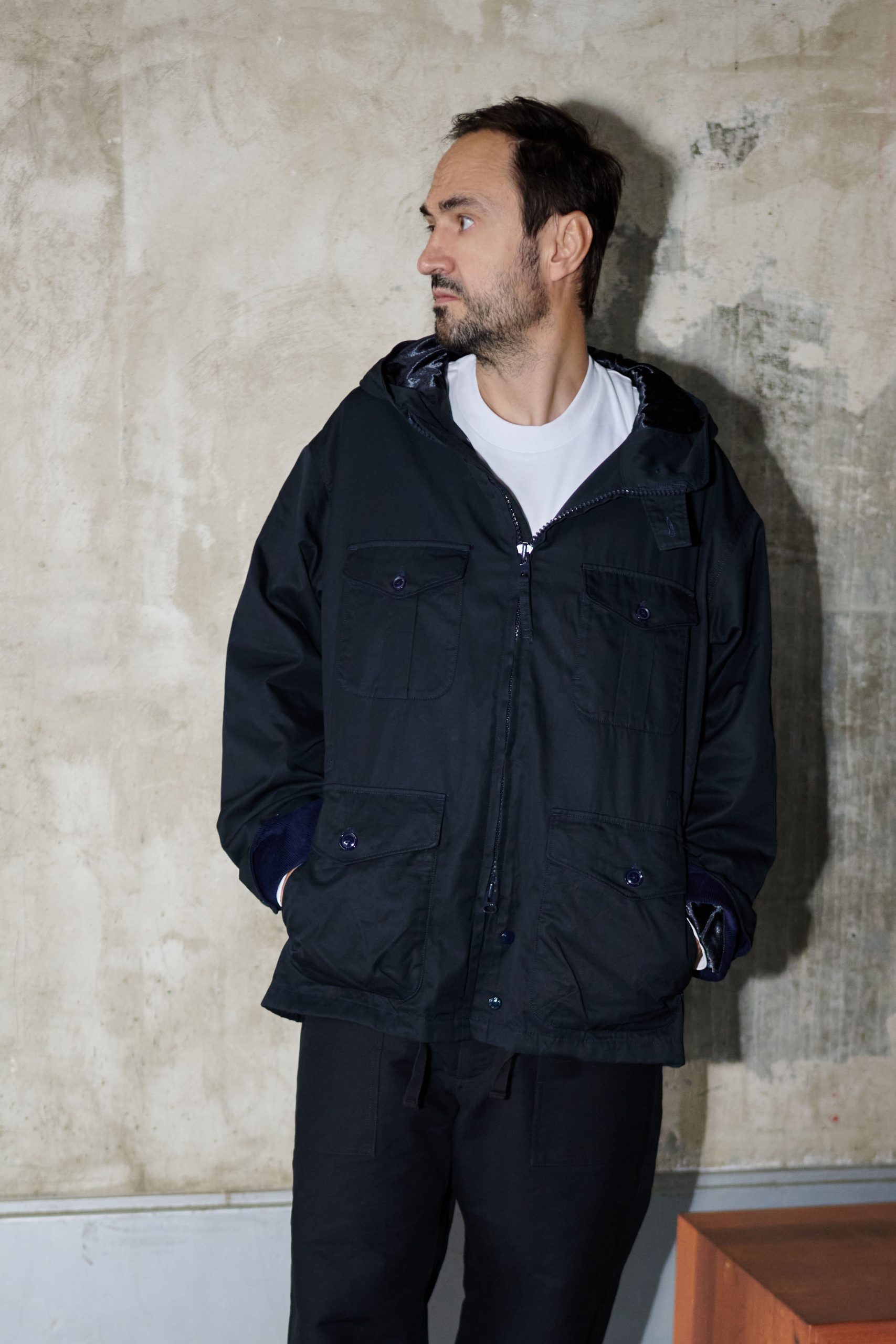 The SAS jacket from Engineered Garments features a full-length zipper and four pockets. It incorporates additional functional details, including two back pockets, a collar tab, a quilted satin lining, and a hood for added warmth and versatility.