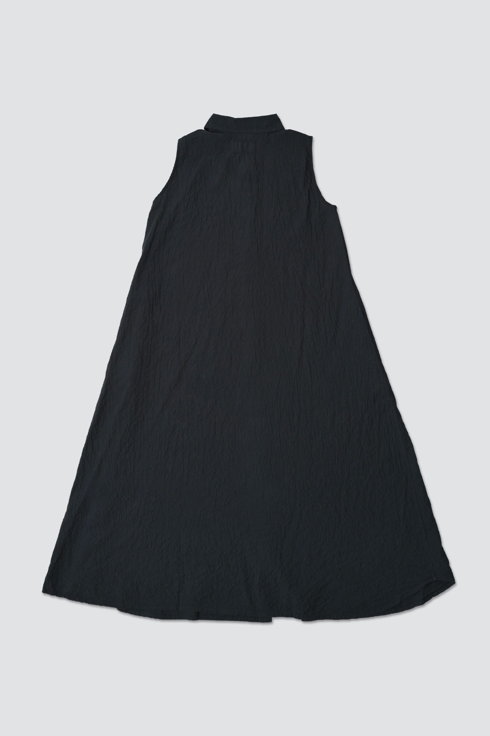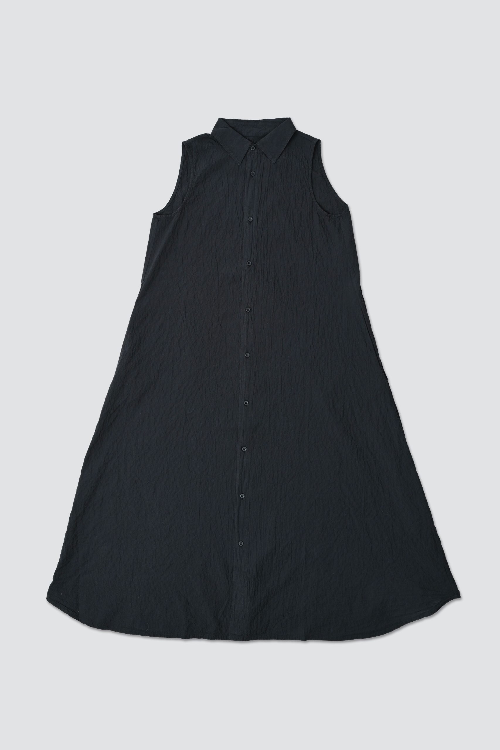 Réalisation : Robe longue sans manches et col polo, en jersey ondulé froissé.