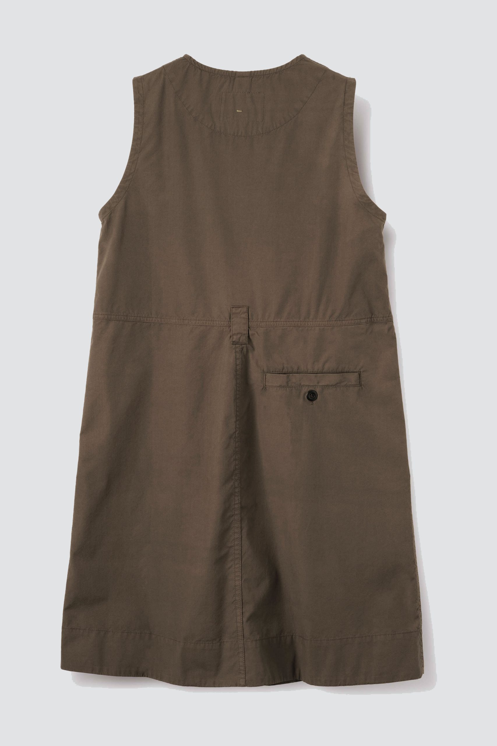 Details : The MHL uniform dress features a classic cut and a slightly flared skirt that falls to the knee. Inspired by the practical silhouette of a work vest, it is made from lightweight, dry-feel indigo black cotton canvas. The waistband, adorned with topstitching, has irregular belt loops and buttoned tabs. The dress has slanted pockets with concealed ticket pockets and a buttoned welt pocket at the back. Classic fit, knee length, corozo buttons, 100% cotton, straight and boxy cut