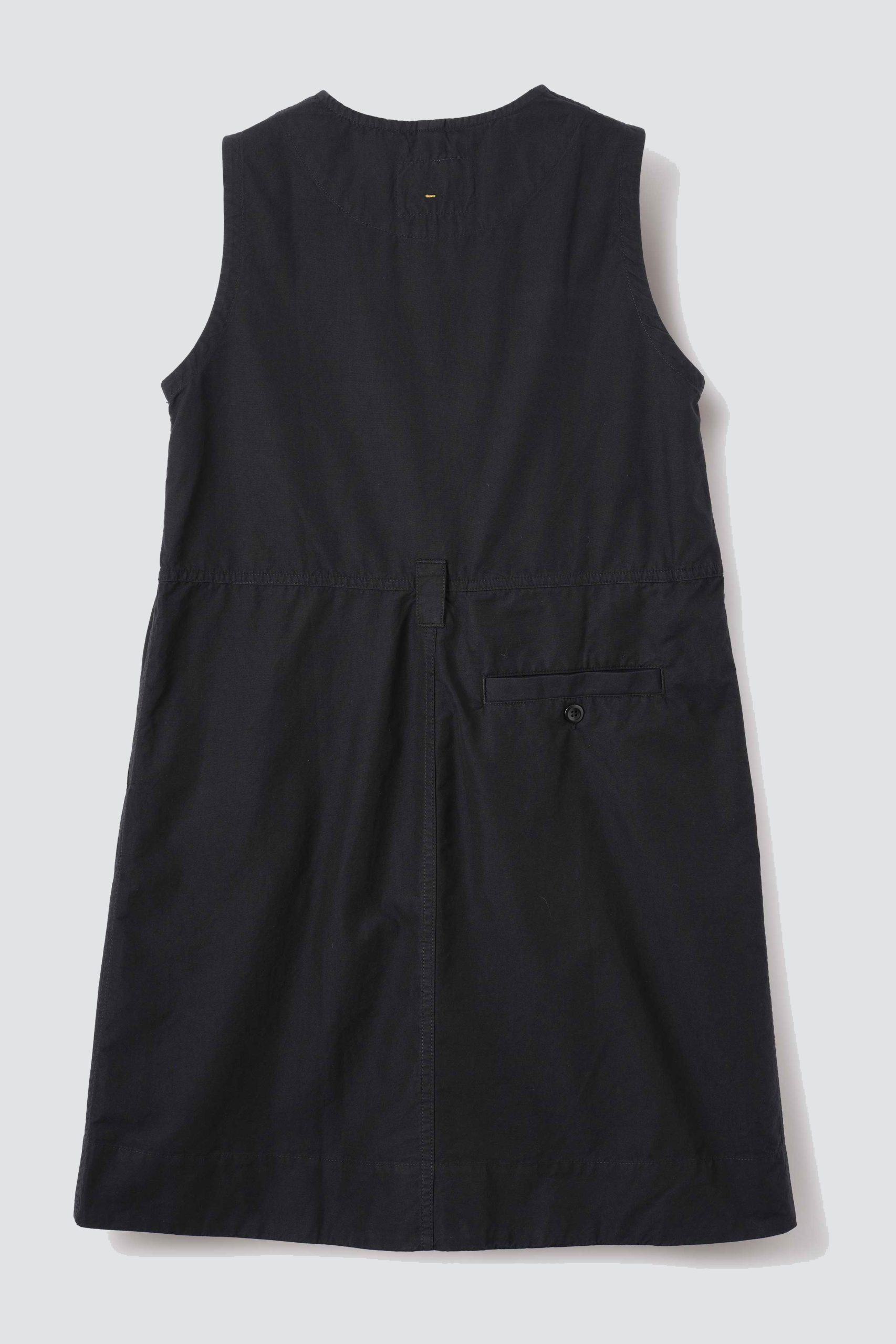 Details : The MHL uniform dress features a classic cut and a slightly flared skirt that falls to the knee. Inspired by the practical silhouette of a work vest, it is made from lightweight, dry-feel indigo black cotton canvas. The waistband, adorned with topstitching, has irregular belt loops and buttoned tabs. The dress has slanted pockets with concealed ticket pockets and a buttoned welt pocket at the back. Classic fit, knee length, corozo buttons, 100% cotton, straight and boxy cut
