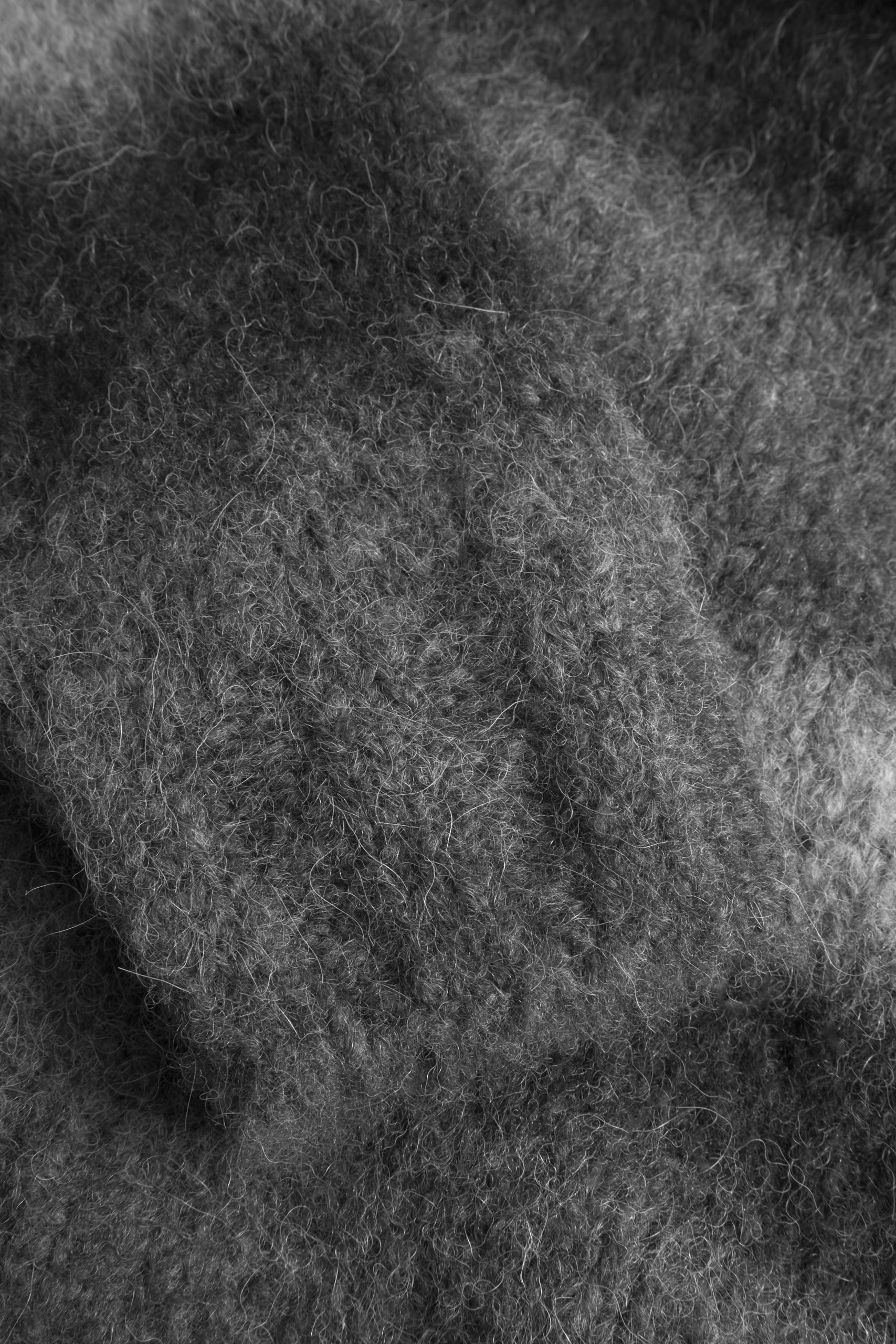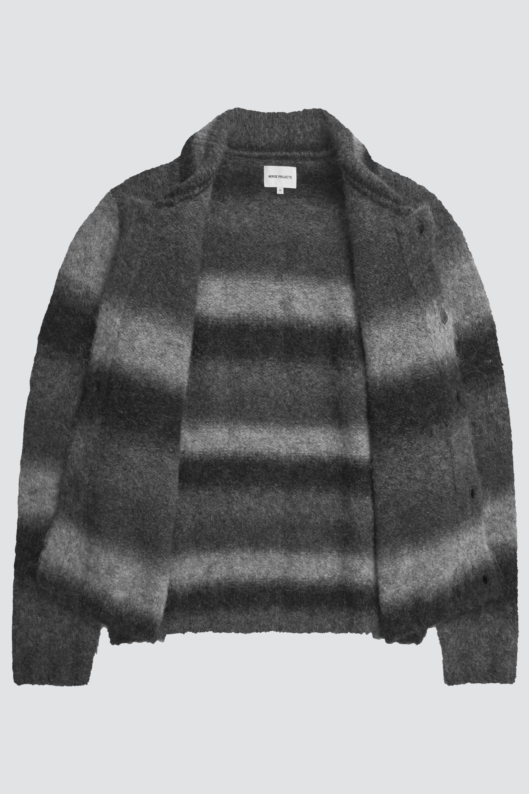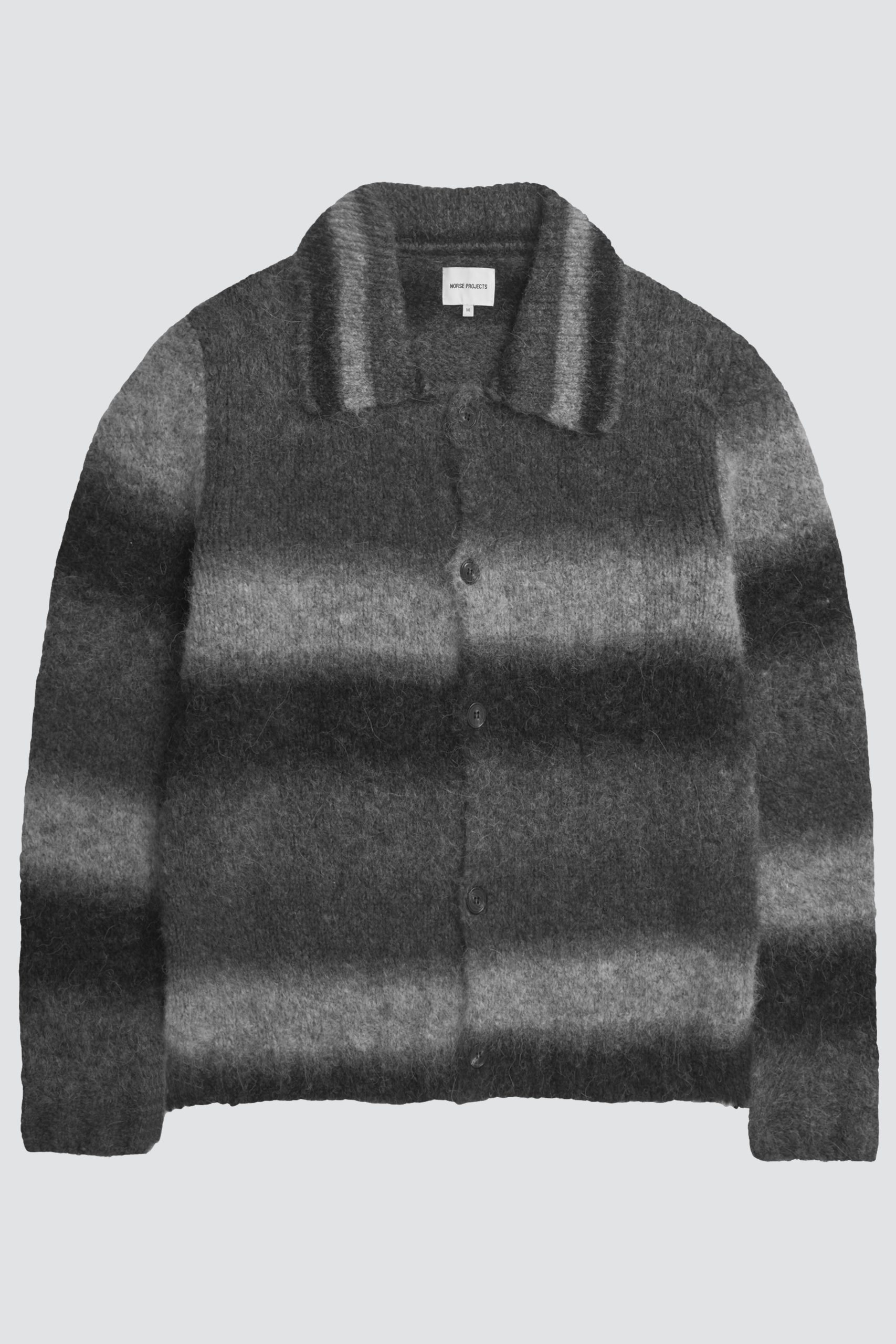Design : Relaxed-fit cardigan knitted in gradient alpaca wool in stockinette stitch. The alpaca provides a light and airy texture, while the wool adds warmth. The yarn is sourced in Italy and manufactured in Romania. This style features fully shaped set-in sleeves and a horn button placket, as well as a 1×1 ribbed hem, cuffs, and collar.