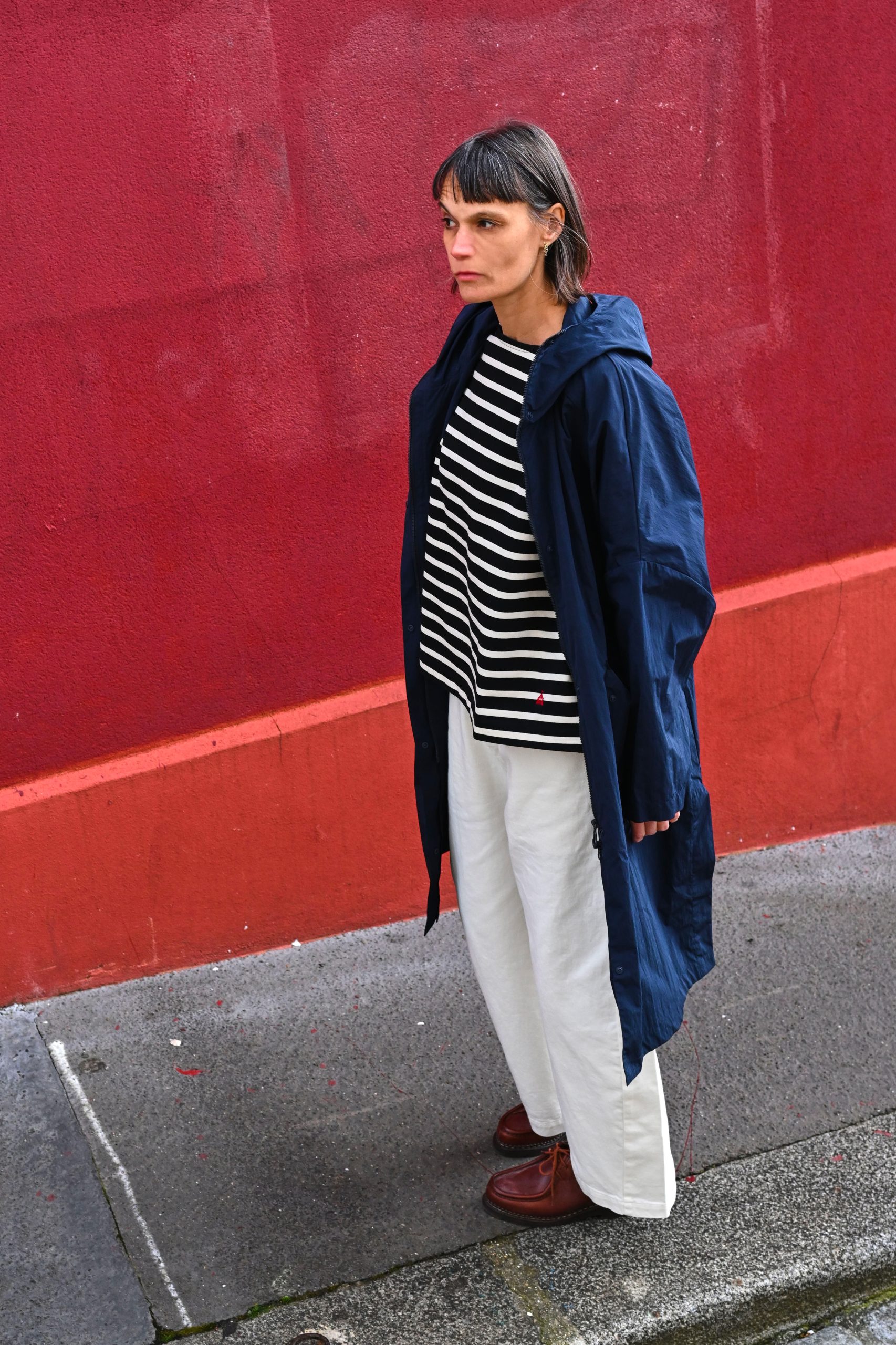 Tissu en mélange coton/nylon à l’aspect froissé et au toucher texturé et sec. Sa surface présente une texture légèrement irrégulière et tridimensionnelle, lui conférant un aspect raffiné et technique. Léger et compact, il allie confort et durabilité à une esthétique contemporaine.