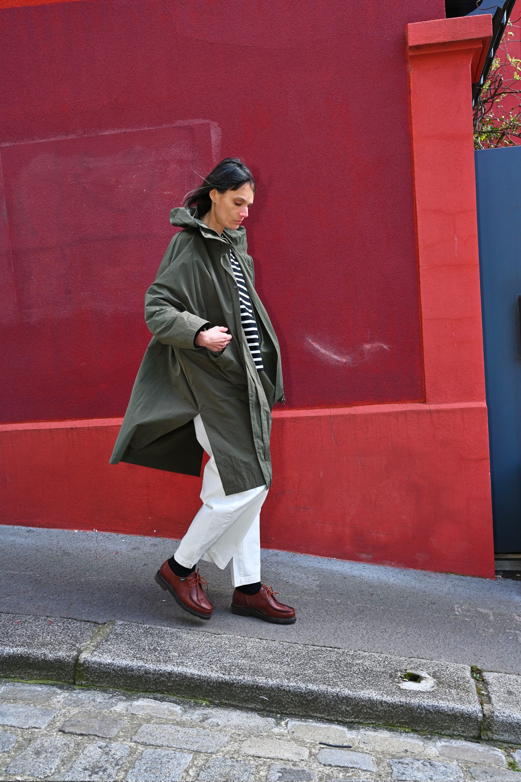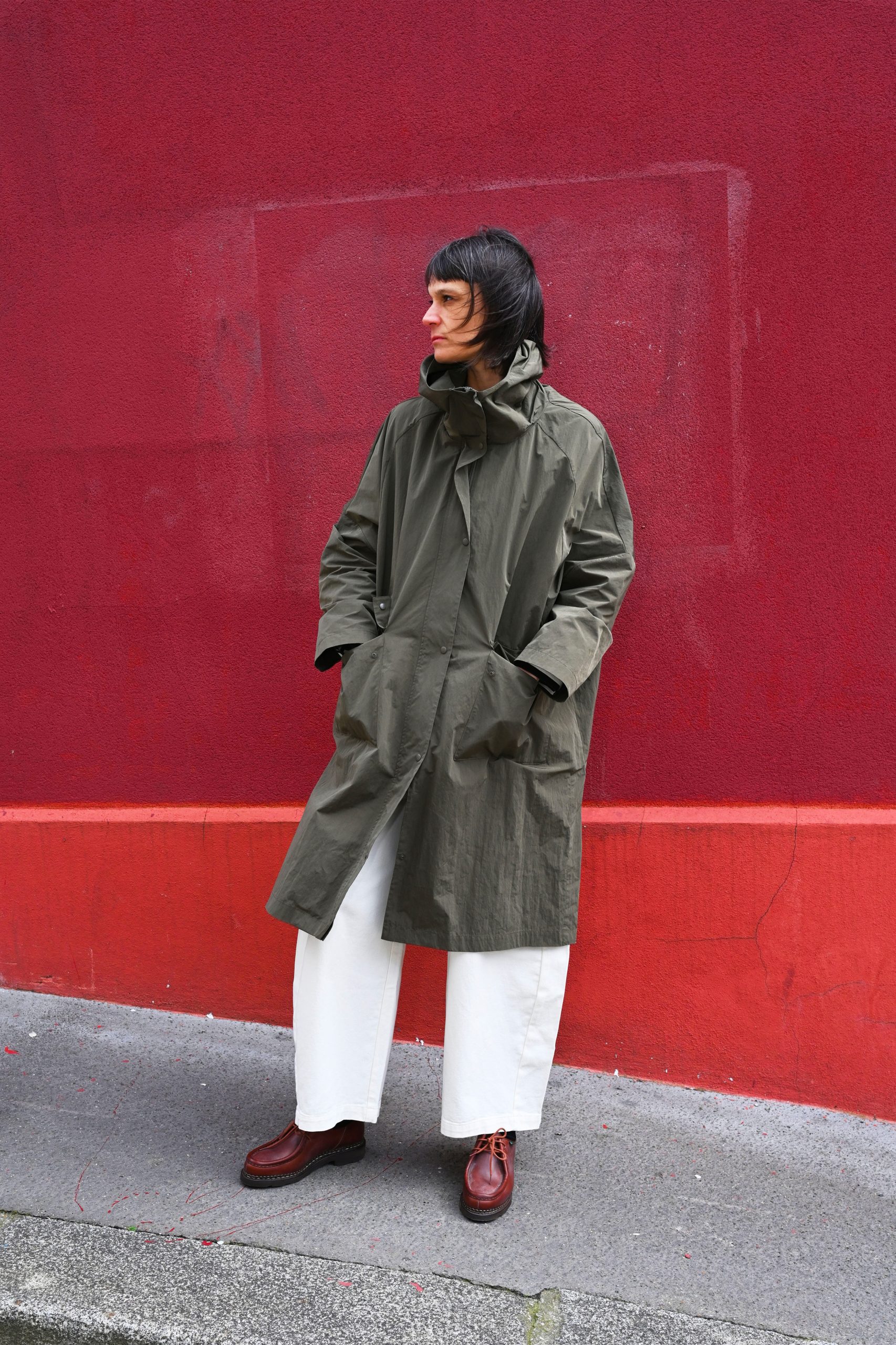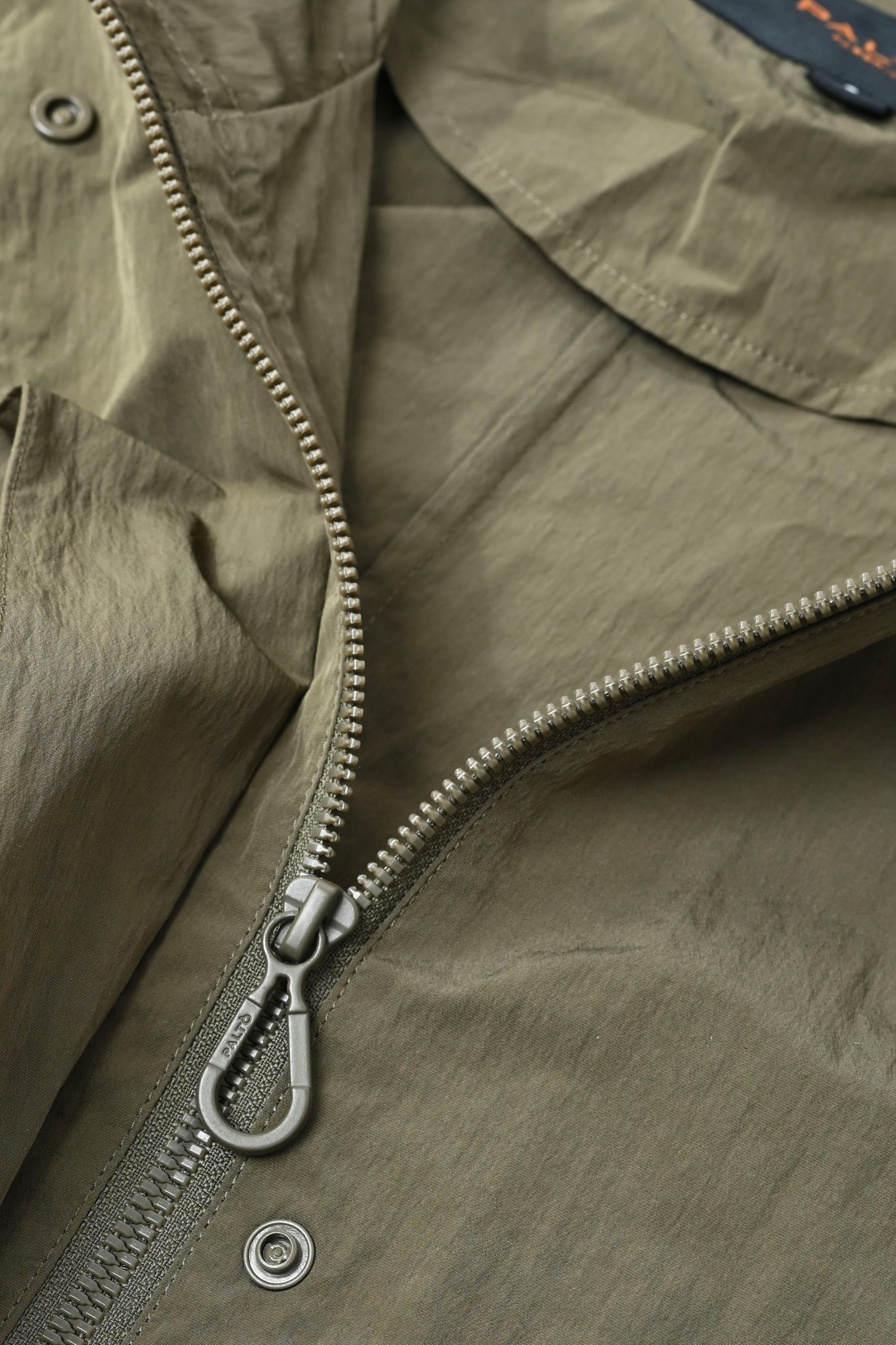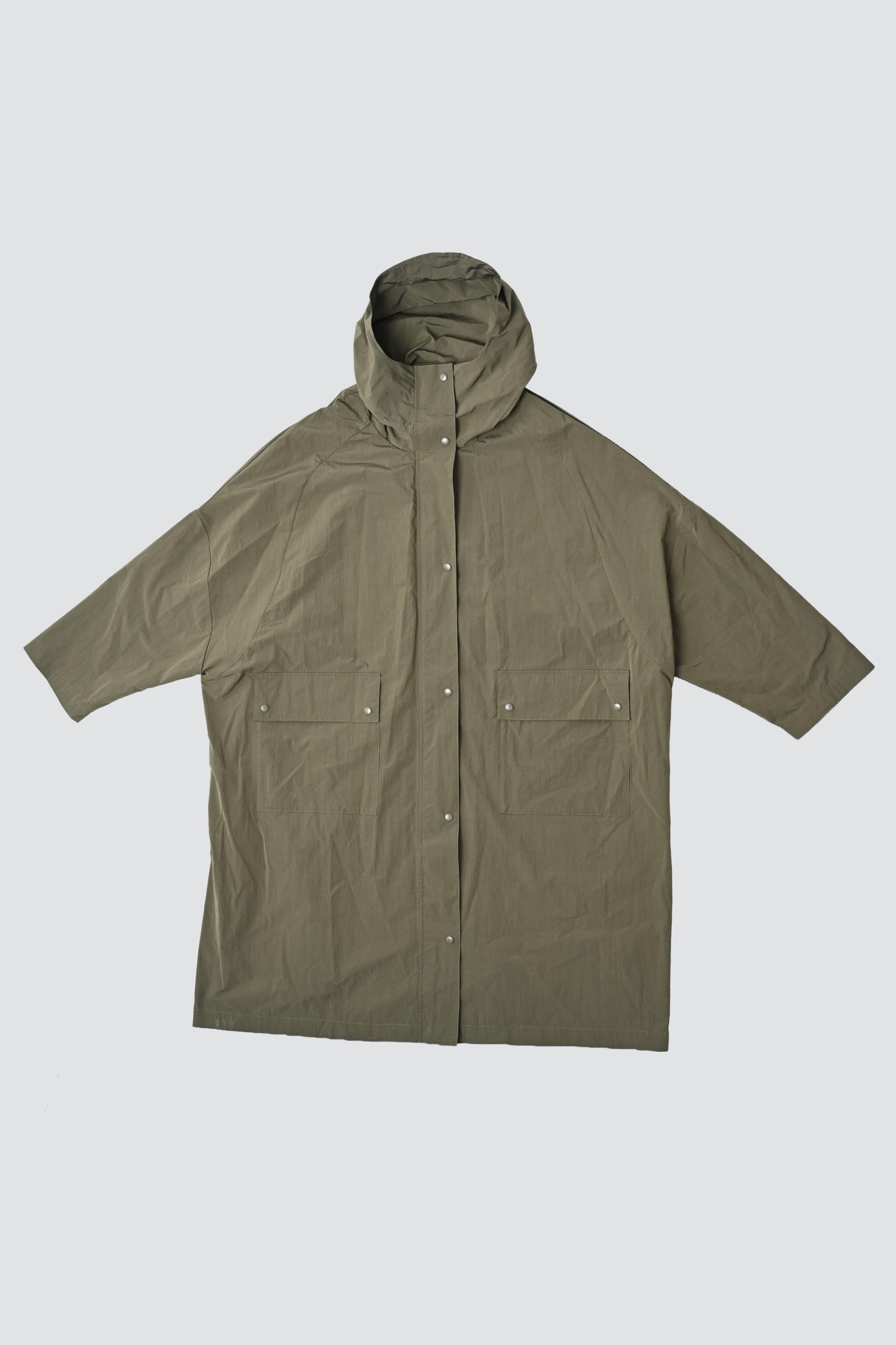 Detail : Parka with a hood and patch pocket. Central zip fastening and side vents. Made from a cotton/nylon blend with a crinkled look and a dry, textured feel. Its surface has a slightly irregular, three-dimensional texture, giving it a refined, technical appearance. Lightweight and packable, it combines comfort and durability with a contemporary aesthetic.
