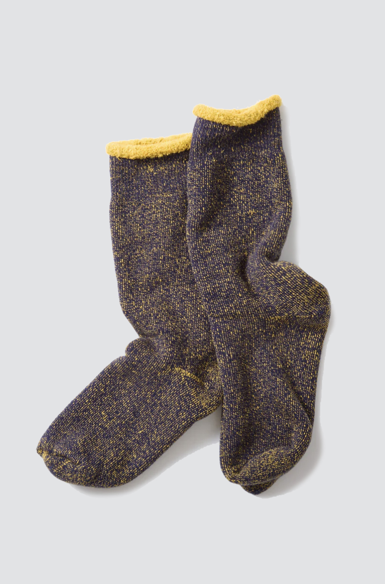 Fully reversible socks. Their design is inspired by the reversible college T-shirts of the 1970s. Knitted on the same machine as the « R1001 DOUBLE FACE CREW SOCKS, » each pair features contrasting cotton yarns on the inside and outside for a distinctive two-tone look.