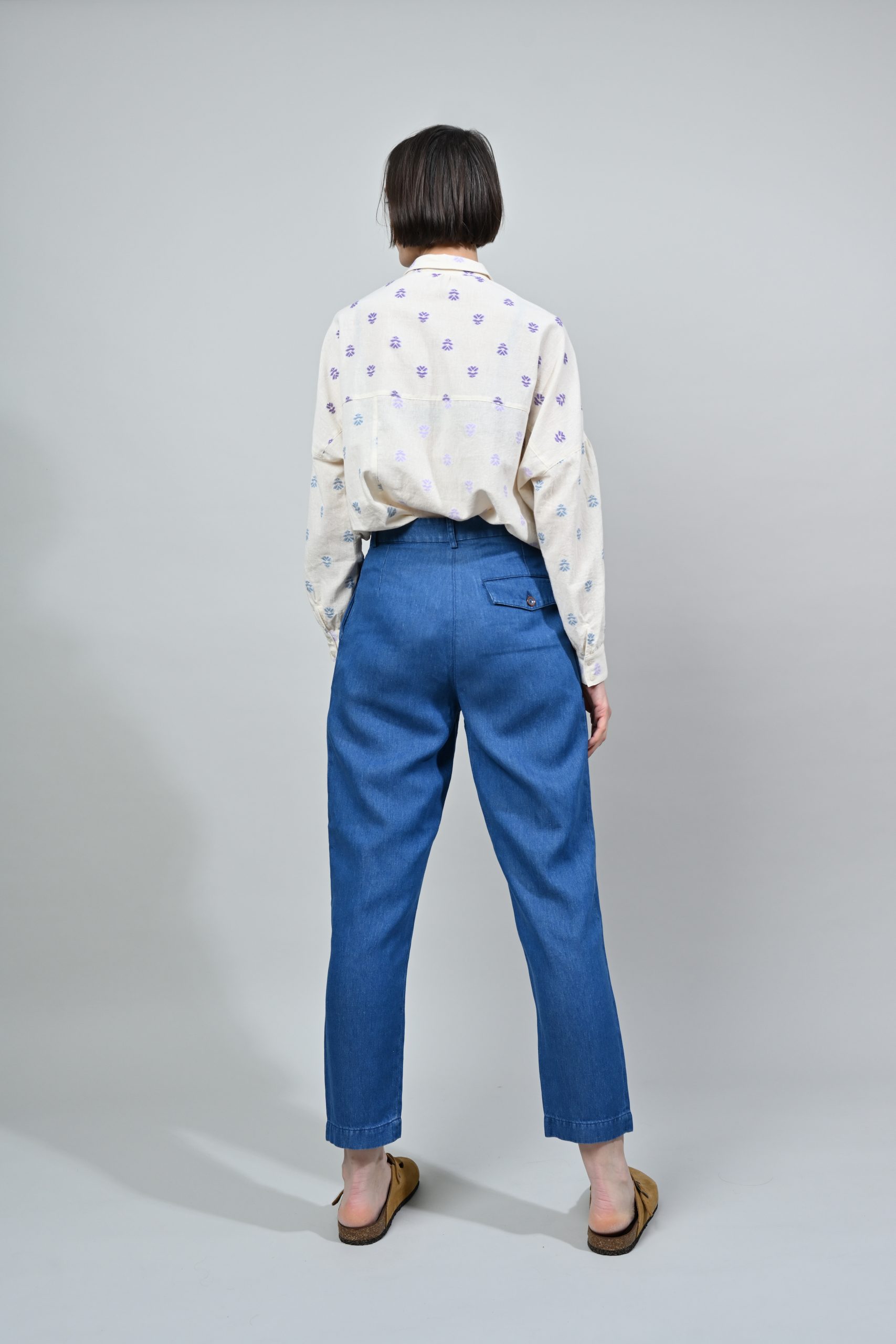 Réalisation : Pantalon tailoring à plis en denim fluide stonewashé tissé en Espagne.
