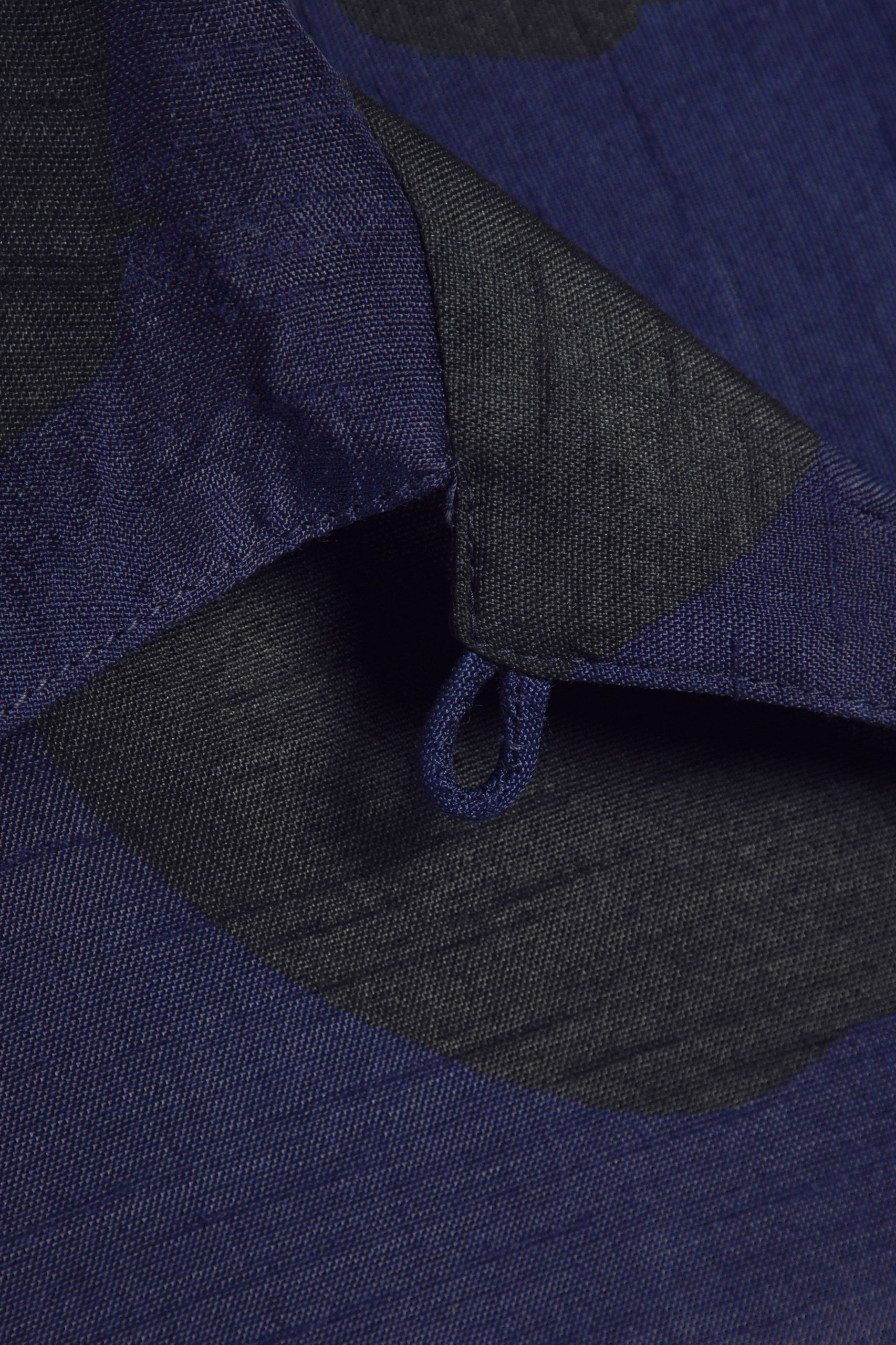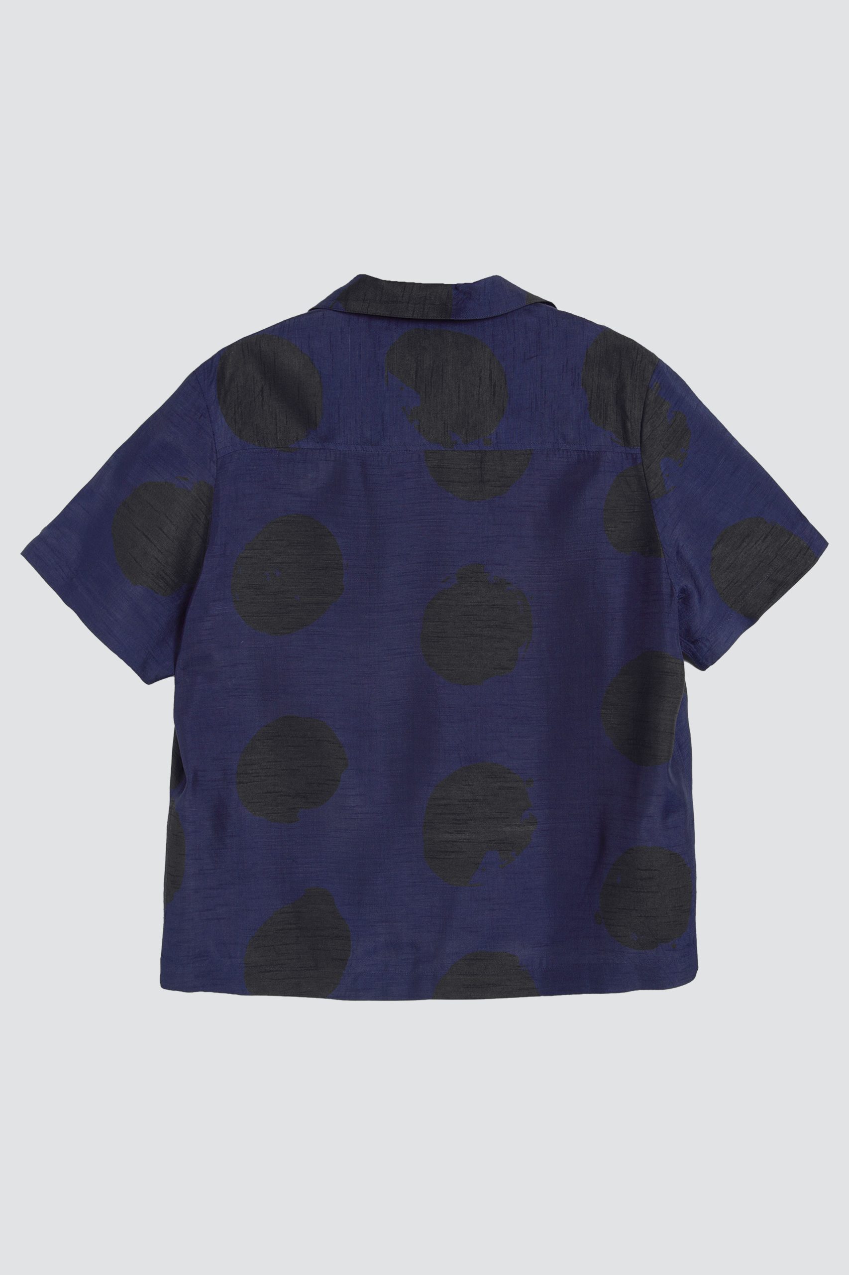 Réalisation : Chemise à manches courtes. Tissu en viscose, motif à pois peint à la main. Col cubain, poche poitrine plaquée. Fermeture boutonnée en corozo. Coupe carrée